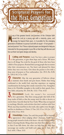 Guided prayers, with supporting scriptures, to pray for the young people in your life – covers calling and purpose, character, friendships, moral compass, money, walk with God, and more!